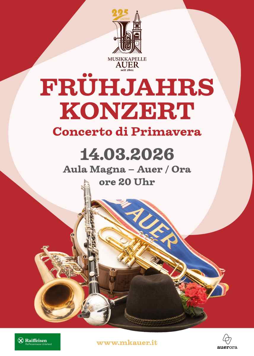 Die Musikkapelle Auer lädt herzlich zum Frühjahrskonzert am Samstag, 14. März 2026, um 20 Uhr in der Aula Magna der Landwirtschaftlichen Oberschule Auer ein. ...